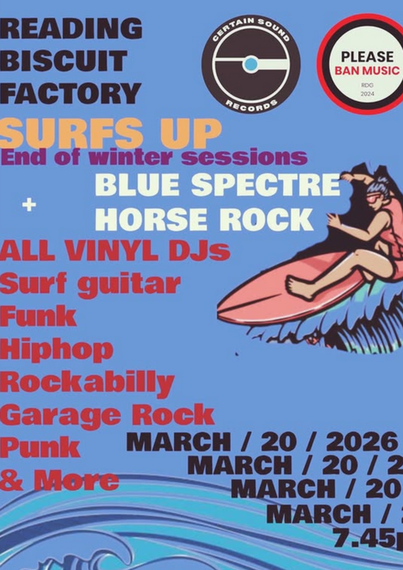 It’s the end of the winter so get yourself down to @rdgbiscuitfactory for two excellent surfy bands by the names of @bluespectreband + Reading's own Horse Rock.